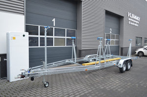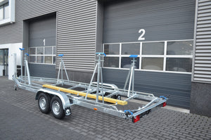 El remolque para veleros de 8,4 m y 2 ejes de 1350 kg es nuestro segundo modelo más largo. Ideal para transportar su velero. Mide 8,4 metros de largo y cuenta con dos ejes de 1350 kg con rodamientos estancos y freno de inercia Knott. Los soportes de sentina son de poliuretano, lo que evita arañazos y marcas en su embarcación. Su robusto armazón está totalmente galvanizado y diseñado para una larga vida útil.