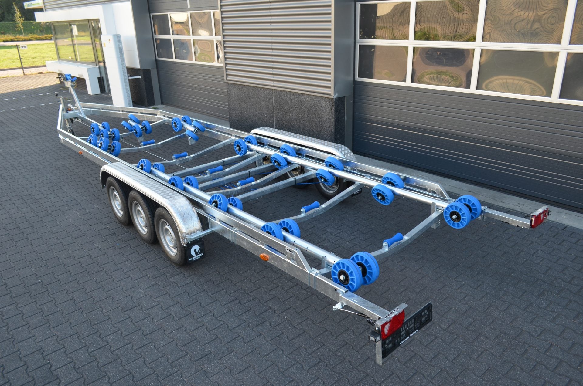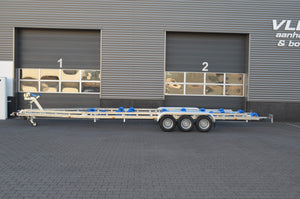 El remolque Flex-roll de 10 m y 3 x 1800 kg es ideal para transportar su lancha motora, balandra o incluso su lancha de consola. El remolque para embarcaciones tiene 10 metros de largo y cuenta con tres ejes de 1800 kg con rodamientos estancos y freno de inercia Knott. El sistema Flex-Roll consta de ruedas de plástico con neumáticos de poliuretano, lo que evita marcas y arañazos en su embarcación. Su robusto armazón está completamente galvanizado y diseñado para una larga vida útil.