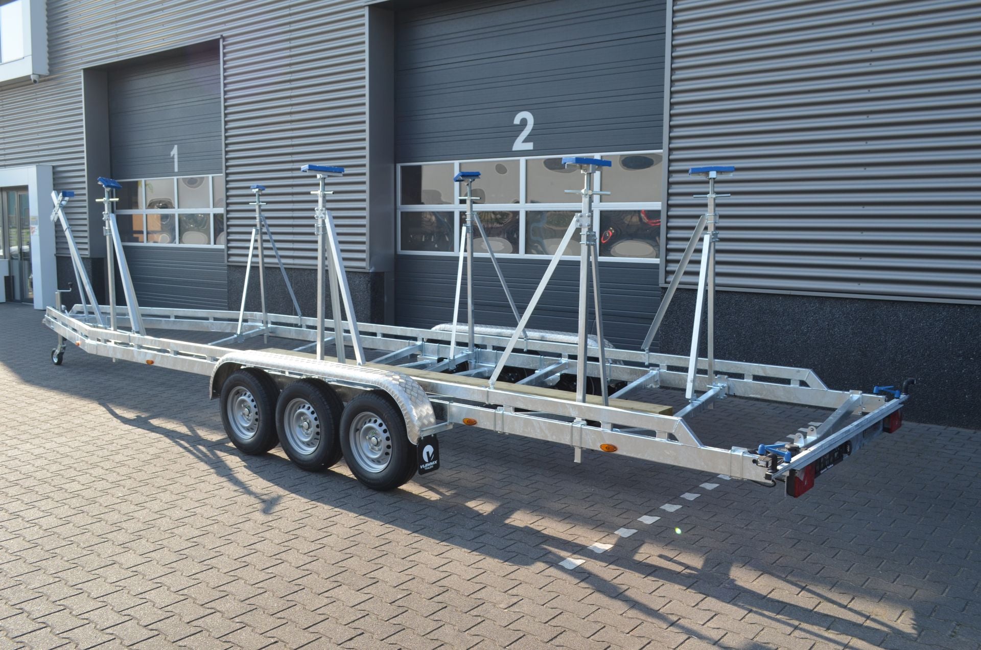 El remolque para veleros de 9,2 m y 3 ejes de 1800 kg es nuestro remolque más largo y es apto para embarcaciones de hasta 3500 kg. Ideal para transportar su velero. Este remolque de 9,2 metros de eslora cuenta con tres ejes de 1800 kg con rodamientos estancos y freno de inercia Knott. Los soportes de sentina son de poliuretano, lo que evita arañazos y marcas. Su robusto bastidor está totalmente galvanizado y diseñado para una larga vida útil.